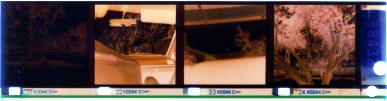 A strip of 126 negatives, showing the square format and single perforation. The film is pre-exposed with frame lines and numbers, a feature intended to make printing and viewing easier.