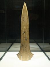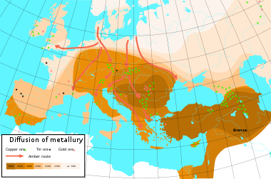The Bronze Age is characterized by the widespread use of bronze, even if only by elites in the early years, though the introduction and development of bronze technology were not universally synchronous.[3] Human-made tin bronze technology requires set production techniques. Tin must be mined (mainly as the tin ore cassiterite) and smelted separately, then added to hot copper to make bronze alloy. The Bronze Age was a time of extensive use of metals and of developing trade networks. A 2013 report suggests that the earliest tin-alloy bronze was a foil dated to the mid-5th millennium BC from a Vinča culture site in Pločnik, Serbia, although this culture is not conventionally considered part of the Bronze Age.[4]; however, the dating of the foil has been disputed.[5][6]