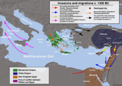 Bronze Age collapse theories have described aspects of the end of the Bronze Age in this region. At the end of the Bronze Age in the Aegean region, the Mycenaean administration of the regional trade empire followed the decline of Minoan primacy.[81] Several Minoan client states lost much of their population to famine and/or pestilence. This would indicate that the trade network may have failed, preventing the trade that would previously have relieved such famines and prevented illness caused by malnutrition. It is also known that in this era the breadbasket of the Minoan empire, the area north of the Black Sea, also suddenly lost much of its population, and thus probably some capacity to cultivate crops.[82] Drought and famine in Anatolia may have also led to the Aegean collapse by disrupting trade networks, and therefore preventing the Aegean from accessing bronze and luxury goods.[83]