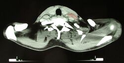 CT image of a 46-year-old person with Hodgkin lymphoma, image at neck height. On the left side of the person's neck enlarged lymph nodes are visible (marked in red).