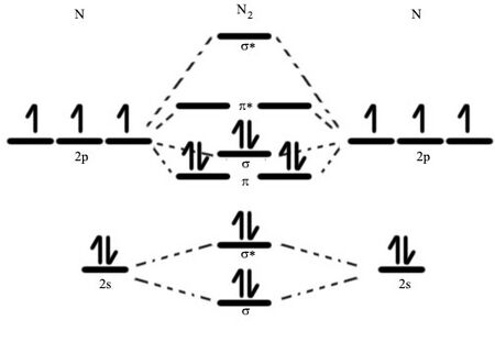 Given the great reactivity of atomic nitrogen, elemental nitrogen usually occurs as molecular N2, dinitrogen. This molecule is a colourless, odourless, and tasteless diamagnetic gas at standard conditions: it melts at −210 °C and boils at −196 °C.[22] Dinitrogen is mostly unreactive at room temperature, but it will nevertheless react with lithium metal and some transition metal complexes. This is due to its bonding, which is unique among the diatomic elements at standard conditions in that it has an N≡N triple bond. Triple bonds have short bond lengths (in this case, 109.76 pm) and high dissociation energies (in this case, 945.41 kJ/mol), and are thus very strong, explaining dinitrogen's low level of chemical reactivity.[22][39]