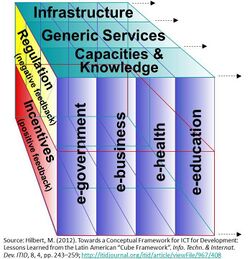 The major goal of ICT for Development is to utilize the benefits of technology for social transformation for good.[12] Previously when such social transformations took place (e.g. industrial revolution), the result was derived from a combined effect of a powerful technology and effective policy and strategy.[13] In the case of ICT4D, this three-dimensional interplay has been depicted as a cube.[14] In line with the Schumpeterian school of thought, the first enabling factor for the associated socio-economic transformations is the existence of technological infrastructure: hardware infrastructure and generic software services. Additionally, capacity and knowledge are the human requirements to make use of these technologies. These foundations (horizontal green dimension in Figure) are the basis for the digitization of information flows and communication mechanisms in different sectors of society. When part of the information flows and communication processes in these sectors are carried out in e-lectronic networks, the prefix "e-" is often added to the sector's name, resulting in e-government, e-business and e-commerce, e-health, and e-learning, etc. (vertical blue dimension in Figure). This process of transformation represent the basic requirements and building blocks, but they are not sufficient for development. The mere existence of technology is not enough to achieve positive outcomes (no technological determinism). ICT4D strategies and policies focus on accelerating development works, minimizing drawbacks and removing bottlenecks with the use of technology to meet goals. Generally, interventions are of two kinds: Positive Assessment (e.g. incentives, projects, financing etc.) that make existing opportunities more prominent and Negative Assessment (e.g. regulation and legislation, etc.) that controls and suppress negative developments(diagonal yellow-red dimension in Figure).[14]