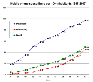 One of the most positive trends has been observed in voice communications. Thus, the proportion of mobile phone subscriptions in developing countries increased from about 30 percent of the world total in 2000 to more than 50 percent in 2004 and to almost 70 percent in 2007.[15] In India, the total number of mobile phone subscriptions reached 851.70 million in June 2011, among which 289.57 million came from rural areas, with a higher percentage of increase than that in urban areas.[16] Only about 35 percent of the population in developing countries has access to the Internet (versus about 80 percent in advanced economies).[17]