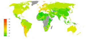 Though the rates of smoking among people in developed countries are on a slow decline, smoking rates among middle and low-income countries are increasing.[53] This particularly affects women within developing regions because they are most at risk when male cigarette use is high.[53] About 70% of tobacco users live in developing countries, and about half of the men in these countries are smokers.[54] Although women are not mainly the ones to smoke, they are still exposed to environmental tobacco smoke (ETS). When among men who smoke, the risks of passive smoking increase for women whether they are at home or at work. Smoking and second-hand smoke not only affects the female body but has detrimental results on the health of their children. This issue is compounded in developing nations that may already have limited medical care for women.