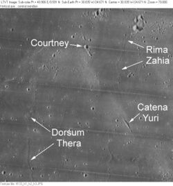 Courtney Crater is on the top left of the Lunar Orbiter 4 image depicting other features in the area