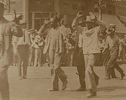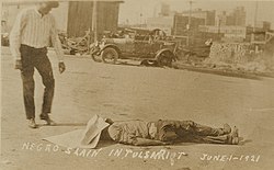 At this point, the mob turned on the Blacks, and an attempt to forcibly disarm a Black war veteran resulted in a fight and then a shot being fired.[1] After a shootout left several people dead, the Black defenders retreated to the Greenwood District.