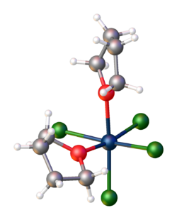 This group 4 halide contains hafnium in the +4 oxidation state. Solid HfCl4 is a polymer with octahedral Hf centers. Of the six chloride ligands surrounding each Hf centre, two chloride ligands are terminal and four bridge to another Hf centre. In the gas phase, both ZrCl4 and HfCl4 adopt the monomeric tetrahedral structure seen for TiCl4.[12] Electronographic investigations of HfCl4 in gas phase showed that the Hf-Cl internuclear distance is 2.33 Å and the Cl...Cl internuclear distance is 3.80 Å. The ratio of intenuclear distances r(Me-Cl)/r(Cl...Cl) is 1.630 and this value agrees well with the value for the regular tetrahedron model (1.633).[10]