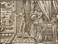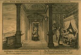Morpheus appears to Alcyone. Engraving by Virgil Solis for Ovid's Metamorphoses Book XI, 650–749.
