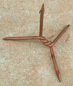 Caltrops are still sometimes used in modern conflicts, such as during the Korean War, where Chinese troops, often wearing only light shoes, were particularly vulnerable.[1] In modern times, special caltrops are also sometimes used against wheeled vehicles with pneumatic tires. Some South American urban guerrillas such as the Tupamaros and Montoneros, who called them "miguelitos," have used caltrops to avoid pursuit after ambushes.[2]