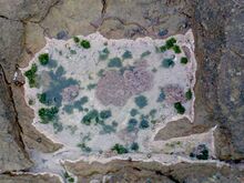 Depending on the substratum and topography of the shore, additional features may be noticed. On rocky shores, tide pools form in depressions that fill with water as the tide rises. Under certain conditions, such as those at Morecambe Bay, quicksand may form.[3]
