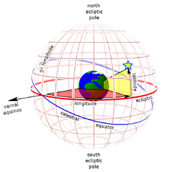 Earth-centeredecliptic coordinates as seen from outside the celestial sphere. Ecliptic longitude (red) is measured along the ecliptic from the vernal equinox. Ecliptic latitude (yellow) is measured perpendicular to the ecliptic. A full globe is shown here, although high-latitude coordinates are seldom seen except for certain comets and asteroids.