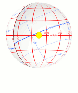 The apparent motion of the Sun along the ecliptic (red) as seen on the inside of the celestial sphere. Ecliptic coordinates appear in (red). The celestial equator (blue) and the equatorial coordinates (blue), being inclined to the ecliptic, appear to wobble as the Sun advances.