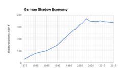 There is a direct relationship between high self-employment of a country to its above average shadow economy.[41] In highly industrialized countries where shadow economy (per capita) is high and the huge private sector is shared by an extremely small elite of entrepreneurs a considerable part of tax evasion is practised by a much smaller number of (elite) people. As an example German shadow economy in 2013 was 4.400 € per capita, which was the 9th highest place in EU, whereas according to OECD only 11.2% of employed people were self-employed (place 18).[42] On the other hand, Greece's shadow economy was only 3.900 € p.c (place 13) but self-employment was 36.9% (place 1).