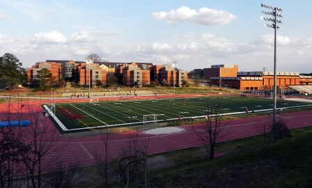 A view of the NCCU track, soccer field along with Richmond Residence Hall and the LeRoy T. Walker Physical Education Complex (far right)