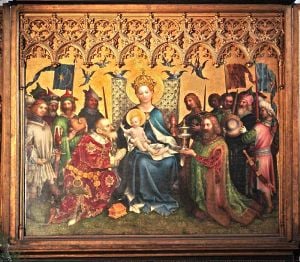 In the Sacrament Chapel, is the Mailänder Madonna ("Milan Madonna"), dating from around 1290, a wooden sculpture depicting the Blessed Virgin Mary and the infant Jesus. The altar of the patron saints of Cologne with an altar piece by the International Gothic painter, Stephan Lochner is in the Marienkapelle ("Saint Mary's Chapel").