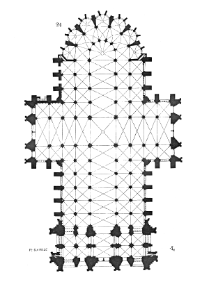 The design of Cologne Cathedral closely resembles that of Amiens Cathedral in terms of groundplan, style and the width to height proportion of the central nave. The plan is in the shape of a Latin Cross, as is usual with Gothic cathedrals. It has two aisles on either side, which help to support one of the highest Gothic vaults in the world, being nearly as tall as that of the Beauvais Cathedral. Externally the outward thrust of the vault is taken up by French-style flying buttresses. The eastern end has a single ambulatory, the second aisle leads into a chevet of seven radiating chapels.