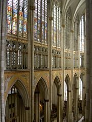 Internally, the Medieval choir is more varied and less mechanical in its details than the nineteenth century building. It presents a French style arrangement of a very tall arcade, a delicate narrow triforium gallery lit by windows and with detailed tracery merging with that of the windows above. The clerestory windows are tall and retain some old figurative glass in the lower sections. The whole is united by the tall shafts which sweep unbroken from floor to their capitals at the spring of the vault. The vault is of plain quadripartite arrangement.