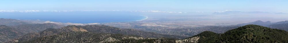 The coastline of Northern Cyprus features two bays: the Morphou Bay and the Famagusta Bay, and there are four capes: Cape Apostolos Andreas, Cape Kormakitis, Cape Zeytin and Cape Kasa, with Cape Apostolos Andreas being the endpoint of the Karpaz Peninsula. The narrow Kyrenia mountain range lies along the northern coastline, and the highest point in Northern Cyprus, Mount Selvili, lies in this mountain range with an altitude of 1,024 metres (3,360 ft).[82] The Mesaoria plain, extending from the Güzelyurt district to the eastern coastline is another defining landscape. The Mesaoria plains consist of plain fields and small hills, and is crossed by several seasonal streams. The eastern part of the plain is used for dry agriculture, such as the cultivation of wheat and barley, and are therefore predominantly green in the winter and spring, while it turns yellow and brown in the summer.[83]