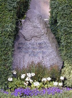 Mauthner died at age 74 on 29 June 1923.[5] Hedwig Mauthner continued to live in the Glaserhäusle after her husband's death. During the National Socialist regime, as the widow of a Jew, she was banned from publishing books in 1933 and her pension payments were stopped. She survived through the help of friends and the Meersburg town priest Wilhelm Restle, and died impoverished in 1945.[23] Fritz and Hedwig Mauthner are buried together at Meersburg cemetery; their gravestone reads Vom Menschsein erlöst (Redeemed from being human).