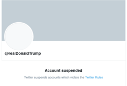 The effects of misinformation were further on display during the 2020 United States presidential election, where social media usage had an impact on Congress.[138] Starting as early as April 2020, then-President Donald Trump tweeted about the dangers of widespread mail voting fraud[139] even though studies have shown that mail voting fraud is rare and the dangers are negligible.[140] Even after losing the election, Trump continued to use Twitter as his main platform to speak about rigged elections, mail-in voter fraud, and other proven falsehoods.[139] On January 6, 2021, Congress was set to certify the results of the 2020 election whilst a rally of Trump supporters were protesting the election results based on Trump's claims of fraud. This assembly of his supporters quickly turned violent, as a mob stormed the Capitol with the intent to overturn election results.[141] The insurrection, which killed five people,[142] was the culmination of Trump's long thread of disinformation spread on social media. As a result, Trump was permanently suspended from Twitter two days later because his involvement in the insurrection violated Twitter's terms and conditions regarding the "glorification of violence".[143] Alongside being suspend from other major social media sites such as Facebook and YouTube,[144] Trump was impeached by the House of Representatives because of his incitement of the insurrection. This incident started a heated debate about social media companies' abilities to limit free speech; ultimately, these companies are still private businesses who are allowed to determine their own terms and conditions as they see fit, which users must agree to in order to use these platforms in the first place.