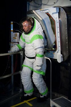 Testing has been taking place in combination with the Z-1 prototype spacesuit inside NASA's human-rated thermal vacuum chamber B at the Johnson Space Center.[14] Early uncrewed tests of the suitport were conducted in June 2012.[15][16] The first crewed tests of the suitport occurred on 16 and 18 July 2012; during these tests the spacesuit was kept at a pressure of 14.7 psi (1 atm), with the chamber pressure at approximately 6.5 psi (0.44 atm), equivalent to an altitude of 21,000 feet (6,400 m).[16] Future tests were planned for September and August 2012, where NASA planned to keep the spacesuit at a pressure of 8 psi (0.5 atm), and the vacuum chamber at roughly 0 psi (0 atm).[16] Suitports may eventually be tested on the International Space Station.[17]