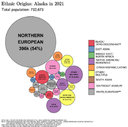 The United States Census Bureau found in the 2020 United States census that the population of Alaska was 733,391 on April 1, 2020, a 3.3% increase since the 2010 United States census.[1] In the 2010 United States Census, Alaska had a population of 710,231, an increase of 13.3%, up from 626,932 at the 2000 U.S. census.