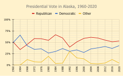 Alaska regularly supports Republicans in presidential elections and has done so since statehood. Republicans have won the state's electoral college votes in all but one election that it has participated in (1964). No state has voted for a Democratic presidential candidate fewer times. Alaska was carried by Democratic nominee Lyndon B. Johnson during his landslide election in 1964, while the 1960 and 1968 elections were close. Since 1972, Republicans have carried the state by large margins.