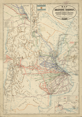 The purpose of the Argentine railway system was not so much to transport people, as to ship out the agrarian products of the pampas.[7] Since Argentina was developing as an agrarian export economy, railroads were built to connect the rural farmland to the main ports of Argentina, as seen in the map of Argentinian Railways in 1910-1911.[7] Most of the lines centre on cities such Buenos Aires or Bahia Blanca and branch out to the pampas in order to retrieve goods to bring back and ship out to European markets, mainly the British. The British would send in industrial goods to make Argentinian agriculture more modern and productive, in exchange for primary products exported to Great Britain.