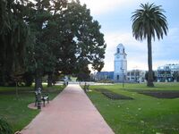 Blenheim is on the Main North Line, the northern part of the unofficially-named South Island Main Trunk Railway. The Coastal Pacific, a long-distance passenger train between Picton and Christchurch, stops at Blenheim railway station.[15] The 1906 station has been listed NZHPT Category II since 1982.[16] It is a standard Vintage station, with Tudor half-timbering and tile.[17]