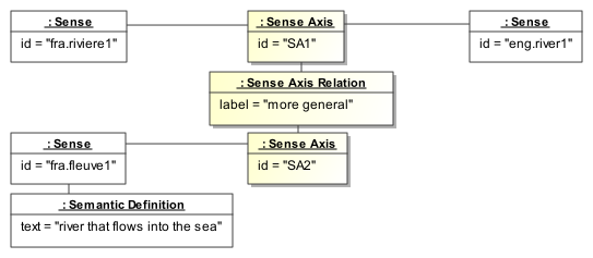 For instance, within LMF, a multilingual notation could be as presented in the following diagram, for English / French translation. In this diagram, two intermediate SenseAxis instances are used in order to represent a near match between fleuve in French and river in English. The SenseAxis instance on the bottom is not linked directly to any English sense because this notion does not exist in English.