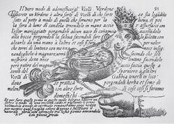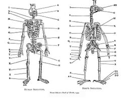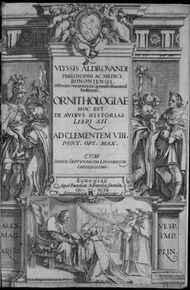 Several early German and French scholars compiled old works and conducted new research on birds. These included Guillaume Rondelet, who described his observations in the Mediterranean, and Pierre Belon, who described the fish and birds that he had seen in France and the Levant. Belon's Book of Birds (1555) is a folio volume with descriptions of some 200 species. His comparison of the skeleton of humans and birds is considered as a landmark in comparative anatomy.[28] Volcher Coiter (1534–1576), a Dutch anatomist, made detailed studies of the internal structures of birds and produced a classification of birds, De Differentiis Avium (around 1572), that was based on structure and habits.[29] Konrad Gesner wrote the Vogelbuch and Icones avium omnium around 1557. Like Gesner, Ulisse Aldrovandi, an encyclopedic naturalist, began a 14-volume natural history with three volumes on birds, entitled ornithologiae hoc est de avibus historiae libri XII, which was published from 1599 to 1603. Aldrovandi showed great interest in plants and animals, and his work included 3000 drawings of fruits, flowers, plants, and animals, published in 363 volumes. His Ornithology alone covers 2000 pages and included such aspects as the chicken and poultry techniques. He used a number of traits including behaviour, particularly bathing and dusting, to classify bird groups.[30][31][32]