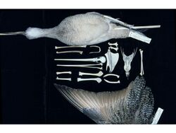 Humans have had an observational relationship with birds since prehistory, with some stone-age drawings being amongst the oldest indications of an interest in birds.[7][8] Birds were perhaps important as food sources, and bones of as many as 80 species have been found in excavations of early Stone Age settlements.[9][10][11] Waterbird and seabird remains have also been found in shell mounds on the island of Oronsay off the coast of Scotland.[7]