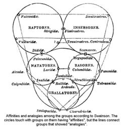 The search for patterns in the variations of birds was attempted by many. Friedrich Wilhelm Joseph Schelling (1775–1854), his student Johann Baptist von Spix (1781–1826), and several others believed that a hidden and innate mathematical order existed in the forms of birds. They believed that a "natural" classification was available and superior to "artificial" ones. A particularly popular idea was the Quinarian system popularised by Nicholas Aylward Vigors (1785–1840), William Sharp Macleay (1792–1865), William Swainson, and others. The idea was that nature followed a "rule of five" with five groups nested hierarchically. Some had attempted a rule of four, but Johann Jakob Kaup (1803–1873) insisted that the number five was special, noting that other natural entities such as the senses also came in fives. He followed this idea and demonstrated his view of the order within the crow family. Where he failed to find five genera, he left a blank insisting that a new genus would be found to fill these gaps. These ideas were replaced by more complex "maps" of affinities in works by Hugh Edwin Strickland and Alfred Russel Wallace.[44][45] A major advance was made by Max Fürbringer in 1888, who established a comprehensive phylogeny of birds based on anatomy, morphology, distribution, and biology. This was developed further by Hans Gadow and others.[46][47]