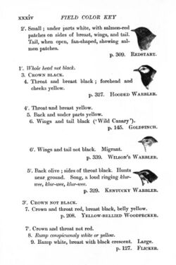 The rise of field guides for the identification of birds was another major innovation. The early guides such as those of Thomas Bewick (two volumes) and William Yarrell (three volumes) were cumbersome, and mainly focused on identifying specimens in the hand. The earliest of the new generation of field guides was prepared by Florence Merriam, sister of Clinton Hart Merriam, the mammalogist. This was published in 1887 in a series Hints to Audubon Workers:Fifty Birds and How to Know Them in Grinnell's Audubon Magazine.[52] These were followed by new field guides,[64] from the pioneering illustrated handbooks of Frank Chapman (ornithologist) to the classic Field Guide to the Birds by Roger Tory Peterson in 1934, including the Birds from the West Indies published in 1936 by Dr James Bond (ornithologist) - the same who inspired the amateur ornithologist Ian Fleming in naming his immortal literary spy.[65]