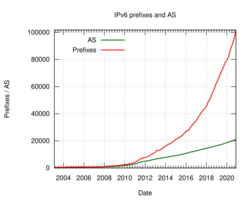 Number of IPv6 prefixes and AS on the Internet since 2003