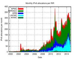 Monthly IPv6 allocations per RIR
