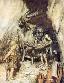 Mime offers food to the young Siegfried, an orphan he is raising; Illustration by Arthur Rackham to Richard Wagner's Siegfried