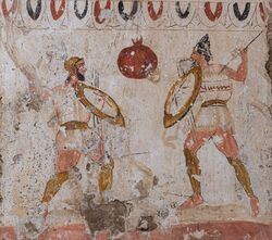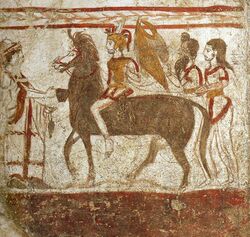 Lucanian art mainly survives in Lucanian vase painting and paintings from tombs, which the elite commissioned in rather large numbers, like the Etruscans but unlike their Roman and Greek neighbours. There is a good display in the museum at Paestum. A high proportion feature horses, often racing.[6] Vase painting was practiced between about 420 BC and 335 BC, and at its height vases were exported to all Apulia. The painters, some of whom have been assigned notnames, were probably Greek emigres, or trained in Greece - probably Athens to judge by their styles.