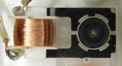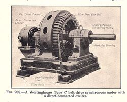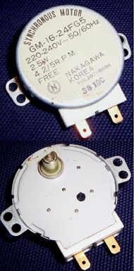 A synchronous electric motor is an AC electric motor in which, at steady state,[1] the rotation of the shaft is synchronized with the frequency of the supply current; the rotation period is exactly equal to an integer number of AC cycles. Synchronous motors use electromagnets as the stator of the motor which create a magnetic field that rotates in time with the oscillations of the current. The rotor with permanent magnets or electromagnets turns in step with the stator field at the same rate and as a result, provides the second synchronized rotating magnet field. A synchronous motor is termed doubly fed if it is supplied with independently excited multiphase AC electromagnets on both the rotor and stator.[2]