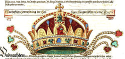 Louis I was succeeded in 1382 by his daughter, Mary.[63] However, most noblemen opposed the idea of being ruled by a female monarch.[63] Taking advantage of the situation, a male member of the dynasty, Charles III of Naples claimed the throne for himself.[64] He arrived in the kingdom in September 1385.[63] Although the Diet forced the queen to abdicate and elected Charles of Naples king, the queen's partisans murdered him in February 1386.[63] Paul Horvat, Bishop of Zagreb initiated a new rebellion and declared his infant son, Ladislaus of Naples king.[65] They captured the queen in July 1386, but her supporters proposed the crown to her husband, Sigismund of Luxemburg.[66] Queen Mary was soon liberated,[67] but she never again intervened in the government.[68]