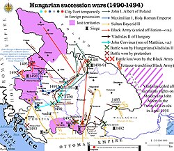 Although Albert's widow, Elizabeth of Luxembourg, gave birth to a posthumous son, Ladislaus V,[107] most noblemen preferred a monarch capable to fight.[108] They offered the crown to Władysław III of Poland.[108] Both Ladislaus and Władysław were crowned which caused a civil war.[109] John Hunyadi, a talented military leader who supported Władysław, rose to prominence during these fights.[109]