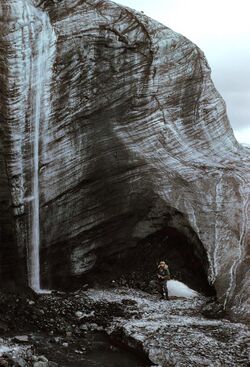 A few glaciers have periods of very rapid advancement called surges. These glaciers exhibit normal movement until suddenly they accelerate, then return to their previous movement state.[32] These surges may be caused by the failure of the underlying bedrock, the pooling of meltwater at the base of the glacier[33] — perhaps delivered from a supraglacial lake — or the simple accumulation of mass beyond a critical "tipping point".[34] Temporary rates up to 90 m (300 ft) per day have occurred when increased temperature or overlying pressure caused bottom ice to melt and water to accumulate beneath a glacier.