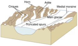 Before glaciation, mountain valleys have a characteristic "V" shape, produced by eroding water. During glaciation, these valleys are often widened, deepened and smoothed to form a U-shaped glacial valley or glacial trough, as it is sometimes called.[53] The erosion that creates glacial valleys truncates any spurs of rock or earth that may have earlier extended across the valley, creating broadly triangular-shaped cliffs called truncated spurs. Within glacial valleys, depressions created by plucking and abrasion can be filled by lakes, called paternoster lakes. If a glacial valley runs into a large body of water, it forms a fjord.