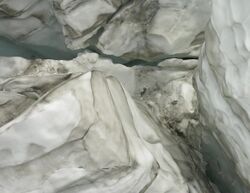 In temperate glaciers, snow repeatedly freezes and thaws, changing into granular ice called firn. Under the pressure of the layers of ice and snow above it, this granular ice fuses into denser firn. Over a period of years, layers of firn undergo further compaction and become glacial ice.[21] Glacier ice is slightly more dense than ice formed from frozen water because glacier ice contains fewer trapped air bubbles.