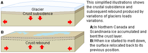 Large masses, such as ice sheets or glaciers, can depress the crust of the Earth into the mantle.[64] The depression usually totals a third of the ice sheet or glacier's thickness. After the ice sheet or glacier melts, the mantle begins to flow back to its original position, pushing the crust back up. This post-glacial rebound, which proceeds very slowly after the melting of the ice sheet or glacier, is currently occurring in measurable amounts in Scandinavia and the Great Lakes region of North America.