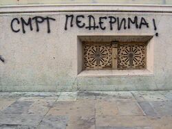 In Serbia, members of Obraz chanted "Death to faggots" (Serbian: Смрт педерима) and posted posters stating "we are waiting for you" (Serbian: чекамо вас) next to an image of a baseball bat. In 2012, the organization was banned by the Constitutional Court of Serbia due to extremism.[52][53]