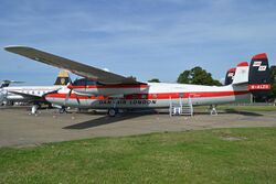 A total of three prototypes were constructed for the test programme.[10] The second Ambassador, G-AKRD,[16] was the first to feature pressurisation and was equipped with a full passenger cabin configuration for demonstration flights.[14] This second prototype was subsequently used by the Bristol Aeroplane Company from 1953 for flight-testing the Bristol Proteus 705 turbine engine. From March 1958, it was used by Rolls-Royce for testing the Dart and Tyne turboprops.[2][17] The third prototype and first Ambassador 2 G-ALFR was initially used for BEA proving trials,[16] and in 1955 it also supported the development trials of the Napier Eland turbine engine. During 1958, intensive simulated airline flying, to pave the way for BEA Vanguards, was performed using two Tyne-powered Ambassadors.[18][19]