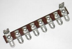 A terminal is the point at which a conductor from a component, device or network comes to an end.[1] Terminal may also refer to an electrical connector at this endpoint, acting as the reusable interface to a conductor and creating a point where external circuits can be connected.[2][3] A terminal may simply be the end of a wire or it may be fitted with a connector or fastener.[citation needed]