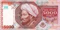 5,000 tenge banknote issued in 2001 with overprint to commemorate the 10th anniversary of independence from the Soviet Union (front).