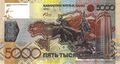 5,000 tenge banknote issued in 2008 to commemorate 15 years of the Kazakhstani tenge (back).